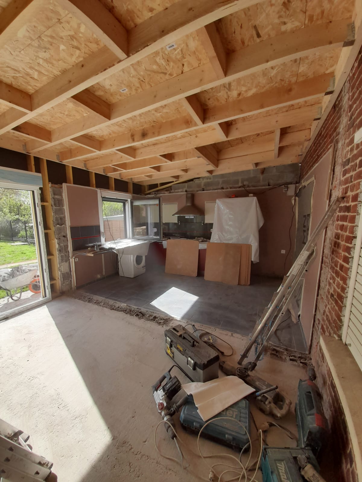 Sur ce chantier situé à Onnaing (59), l’objectif était de gagner de l’espace et de la luminosité en agrandissant la cuisine et le séjour. Le projet comprenait également la démolition d’un mur porteur et la transformation de la toiture existante côté cuisine.